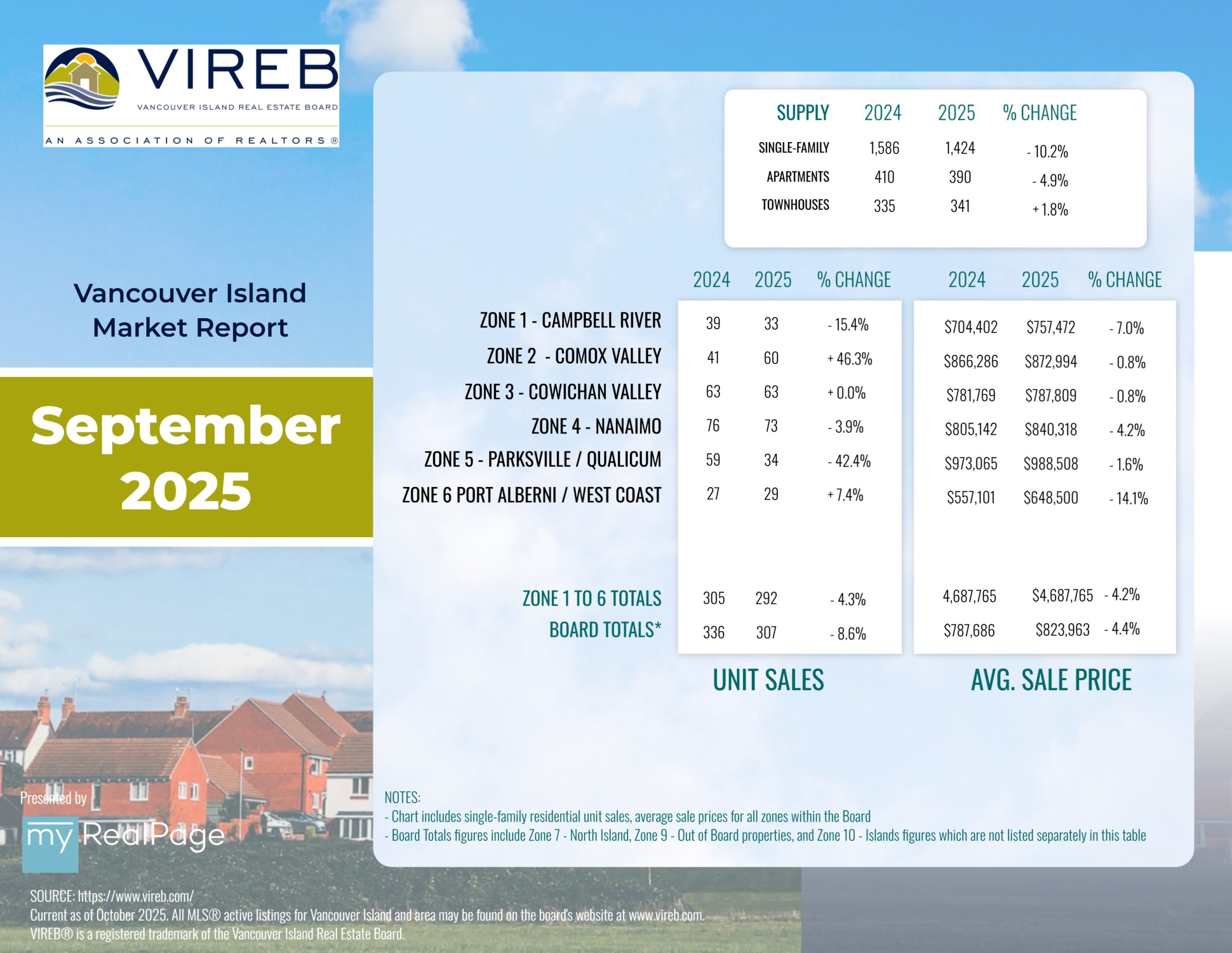 The Vancouver Island Real Estate Board (VIREB) recorded 653 unit sales (all property types) in September 2025, up three per cent from one year ago. Year-over-year active listings (all property types) were 4,293, down four per cent from the previous year.